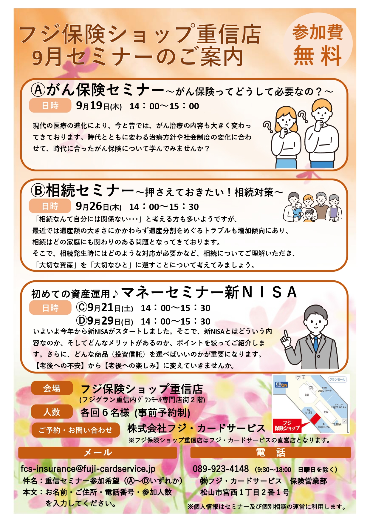 参加費無料・事前予約制 フジ保険ショップ重信店 9月セミナー開催のご案内
